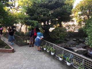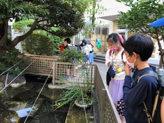 正面玄関から遠い方、橋の奥の方をしきりに気にしています。というのは、今日は魚の姿があまり見えないのです。赤い魚も黒い魚ももっとたくさん泳いでいたはずなのにと心配しています。右の写真に写り込んでいる糸は鳥除けです。今日改めて張り直しをしました。鳥が来て食べてしまったのではないか、物陰に隠れているのなら少しでも姿が見たい、と池の前を行ったり来たりしながら心配しているのです。仙川からサギが飛んで来たのかも知れないと心配している子もいます。先日仙川沿いを町探検した時に見たサギが印象深かったので気になるのです。