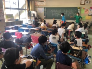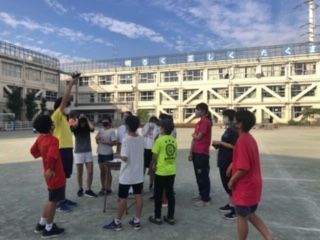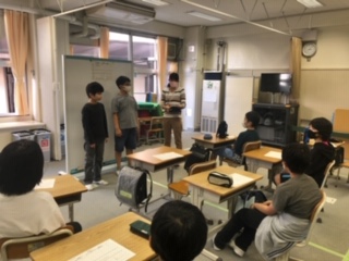 写真は左から、児童管理係、採点係、スタート係の打ち合わせのようすです。児童管理係は1・2年生の学級の補助を担当します。採点係は当日2階教室に設置する採点板を担当します。スタート係は雷管補填の補助をします。