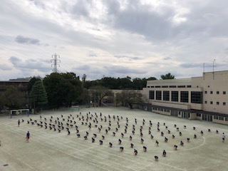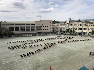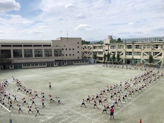 校舎の3階から撮影した学年演技の隊形です。写真は左から、4・5・6年です。隊形移動の詳細は学年だより等でご確認ください。