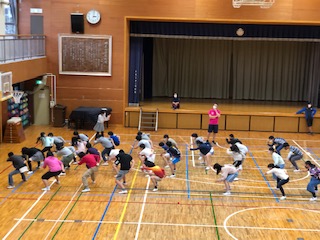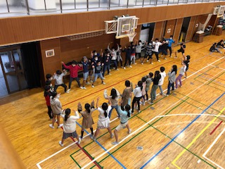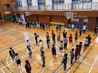 6年生が体育館でクラスごとに練習をしています。自分たちで自分たちの課題を解決するために話し合いをして取り組んでいます。担任は少し離れたところから見守っています。