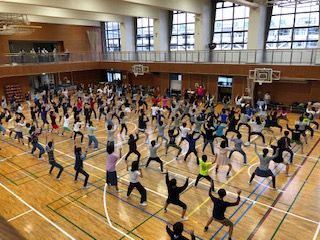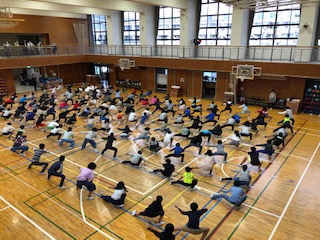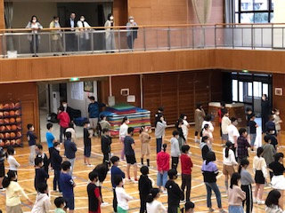 体育館3階のミーティングルームで実施していた学校運営委員会が終了したので、体育館ギャラリーから6年生の練習のようすを参観していただきました。写真は、クラスごとの課題解決の自主練習の後、全体で通している場面です。