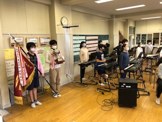 左と中央の写真は、応援団長とミュージック係と開閉会式係の合同練習のようすです。それぞれの係のタイミングを確かめることができて成果がありました。