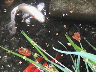 次の2枚の写真は児童が下校した後のようすです。静かになった岩石庭園の池では、子どもたちが会いたいのになかなか姿を見せてくれない白い鯉が悠々と泳いでいました。キンモクセイの花が散って水面にたくさん浮かんでいます。