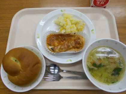 あしたばパン 白身魚のピザ風 コーンポテト 野菜スープ 牛乳