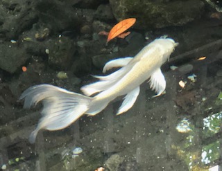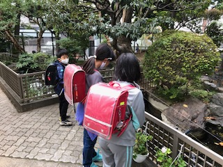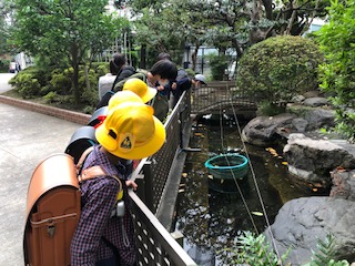 今朝の池のようすはいつもと大きく違いました。白い大きな鯉が土管から出て橋の下辺りで泳いだり、池底の1か所でとどまったりしていました。子どもたちが次々と覗き込んでも隠れるようすがありません。これまではなかなか姿を見られなかった子が多かったので「今日初めて見た」と感激していました。