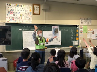 お茶坂の上や下で白いピレネー犬のゲンちゃんと一緒に見守りをしてくださっていた方だと気付き大盛り上がりでした。身近で知っている方、あいさつをしている方だと分かったからです。明正小の第1回卒業生であり、開校当時の明正小のお話をうかがうこともできました。校庭が草ぼうぼうだったことや、午後は校庭の大きな穴を埋める作業を先生たちと一緒にやったことを聞いて興味しんしんでした。自分たちと同じ3年生でしかも最高学年であったことがとても驚きのようでした。