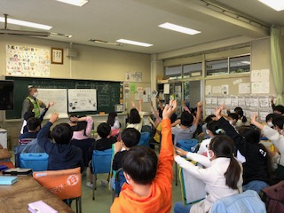 続く2枚の写真は3年総合的な学習の時間「ぼく、わたしは町の応援団」のようすです。成城自治会長・明正小学校同窓会長の岩波さんのお話をぜひ聞きたいという子どもたちの願いを受けてクラスにおいでくださいました。子どもたちは既に町を応援したいとたくさんの「やってみたいこと」をもっています。果たしてそれらが町を応援することになるのか、岩波さんに聞いてみたいという希望でした。