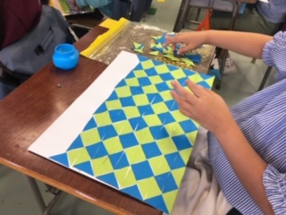 中央の写真は、2年算数「三角形と四角形」の学習のようすです。敷き詰め模様の構成と観察を通して平面図形の広がりや図形の美しさをとらえることをねらいとした学習活動です。直角三角形の貼り方を工夫して敷き詰め模様を作っているところです。人によって多様な敷き詰め模様が生まれています。隙間を開けないように取り組むのはなかなか難しいものです。1年では「さんかく」「しかく」などと呼んで図形をとらえていましたが、2年では三角形や四角形の約束や特徴を直感的に理解していく活動を取り入れることを大切にしています。