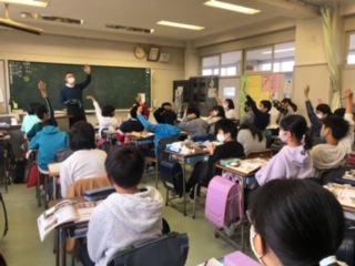 右の写真は、6年社会「今に伝わる室町文化」の学習のようすです。今日の生活文化につながる室町文化が生まれたことを学んでいる場面です。書院造の影響を受けている伝統的な家屋についての話題から、実生活の中での和室の存在について話し合っています。