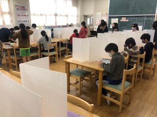 はじめの2枚の写真は、4年国語「図書」の学習のようすです。学校図書館司書は土曜授業の日も出勤しています。子どもたちは自分のパーテーションを図書室まで持参し活用しています。