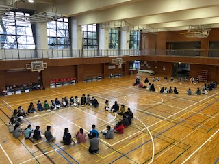 右の写真は、5年と6年の1クラスずつが体育館で交流活動をしているようすです。5・6年は10月29日の大蔵総合運動公園陸上競技場での合同陸上競技会に向けて、学級活動の時間を中心に縦割りでの交流をしています。クラスを二分して5・6年混合の輪をつくり自己紹介を兼ねてスリーヒントクイズで交流している場面です。6年生がよくリーダーシップを発揮しています。楽しく心温まるひとときです。