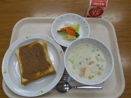 きなこバタートースト ☆豆のシチュー ピクルス 牛乳
