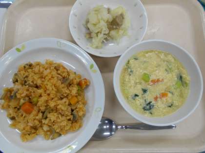 チキンライス ソーセージ入りジャーマンポテト ☆チーズと卵のふわふわスープ 牛乳