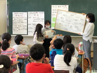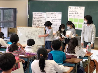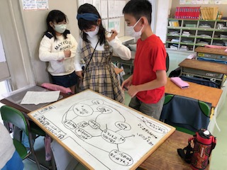 中央と右の写真は、授業時間の終わりに、各グループの今日の学習の状況や今後の計画を簡潔に報告しているようすです。1時間の授業時間のほとんどをグループの話し合いで活用できたので、これからやりたいとや自分たちが考えていることについて大変熱を込めて説明していました。児童が主体的に課題解決を進めているからこその頼もしい姿です。自分以外のグループの考えや計画に関心をもって聞き入っている姿もとても頼もしいです。