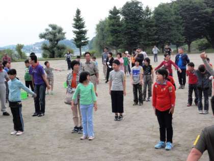 朝は6時30分起床で、7時30分から朝会です。この日は雨も降っていなかったので、園庭で朝会をやりました。元気にラジオ体操をやりました。