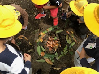 左の写真は、切り株のくぼみを生かしたお弁当作りの続報です。ミミズを発見した子がコア会議の方に報告したところ、タヌキが食べるかも知れないと教えていただき、この大きなお弁当に加えることになりました。動いてもぐっていくミミズをじっと見守っています。その後もミミズが見つかり、その都度、お弁当に加えるかどうか議論していました。入れることに反対の意見もあり、相談はしばらく続いていました。