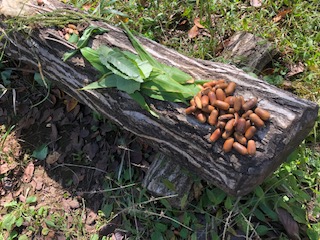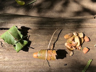 中央と右の写真は、下の広場でのお弁当作りのようすです。木のベンチがお弁当箱になっています。木の葉でドングリを包んだ小さなお弁当もあります。ドングリの皮をむいて中の柔らかいところを食べやすいように工夫したお弁当もあります。