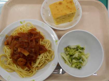 スパゲティシーフードソース ブロッコリーのサラダ ☆ぐりとぐらのかすてら 牛乳