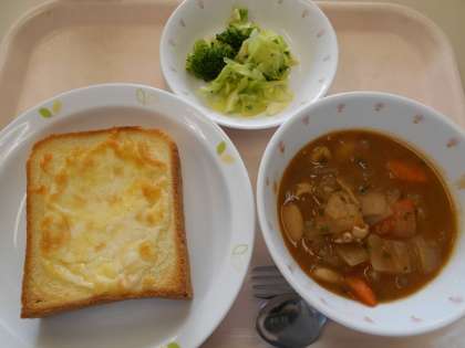 チーズトースト ビーンズシチュー ブロッコリーのサラダ 牛乳
