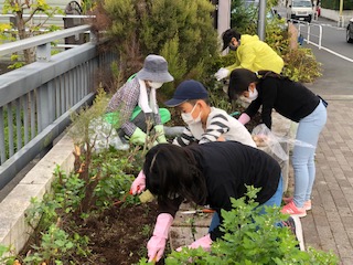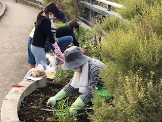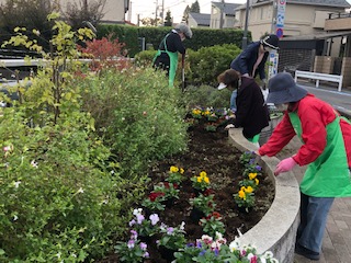 写真は、富士見橋の花壇で「成城フラワーメイト」の皆さんと一緒に活動をしているようすです。スイセンの球根を植えたり、パンジーに水やりをする仕事を担当しました。