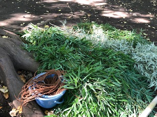今年は密を避けるために、1クラスずつ鉄塔広場で実施しました。ボランティアの皆さんは、4クラスそれぞれにご指導をくださいました。中央の写真は、枝打ちして粗朶(そだ)を作る材料です。
