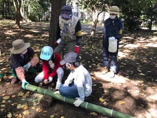 写真は4年生が、成城三丁目緑地の竹林保全と竹材の利活用体験である竹細工の活動をしているようすです。成城三丁目緑地コア会議、世田谷トラスト、明正おやぢの会の皆さんにお力添えをいただきました。ありがとうございました。