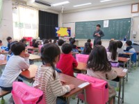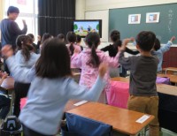 右の写真は、各グループが撮影した動画をみんなで鑑賞している場面です。