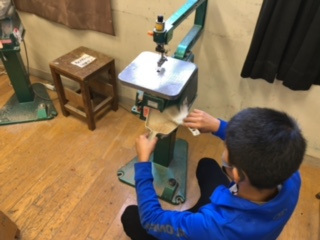 写真は6年図画工作「扉を開けて」の学習のようすです。用途を考え自分で作りたい形を作ることがめあてです。蝶番(ちょうつがい)をどこに取り付けるかに一人一人の思いが表れています。電動ノコギリやキリ、釘などの扱いに気をつけて集中して取り組んでいます。