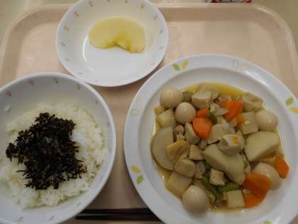 ごはん しそひじきふりかけ 鶏肉と里芋のうま煮 りんご 牛乳