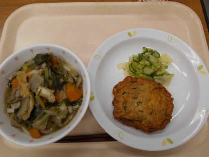 けんちんうどん 手作りさつまあげ キャベツときゅうりのごま風味 牛乳