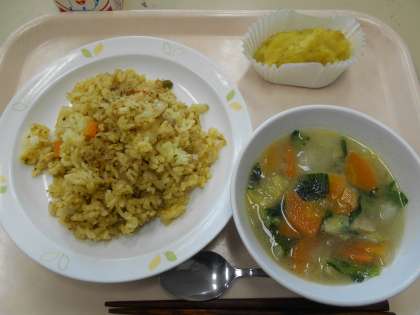 カレーピラフ ベーコンと白菜のスープ スイートポテト 牛乳