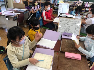 3年生は「地域と仲良くなろう」「地域のことにくわしくなりたい」と願いをもち、テーマに迫る視点や理由が似ている子たちでグループを組んで学習に取り組んでいます。