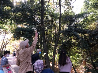左の写真は、公園内の木の高いところに猛禽類のツミの巣のあとがあることを教えてくださっているようすです。ケヤキの木の下では、落ちているケヤキの小枝や葉を拾うと鳥たちが好んでエサにしている実が見られると教わり、みんなで拾って観察しました。公園の落ち葉を掃除しすぎると鳥のエサが足りなくなると聞いて驚きました。鳥の目線で考えると確かにそうだと子どもたちは納得していました。