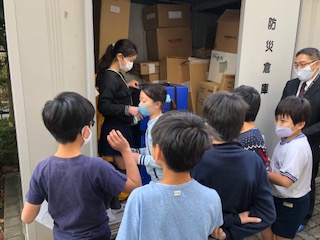 右の写真は、子どもたちの念願だった防災倉庫2棟の見学のようすです。区の防災安全課の勤務経験をおもちの所長さんならではの丁寧なご対応に感謝申し上げます。子どもたちはきっと改めて避難訓練や社会科の学びを振り返ることと思います。今後それぞれのグループがどのように学習を展開していくのかとても楽しみです。