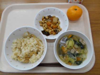 さといもごはん 五目豆 白玉汁 みかん 牛乳