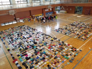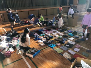 写真は、児童会の環境委員会が全校に呼びかけて集めた子供服を体育館で数えて難民キャンプ等に送る準備をしているようすです。数えた結果、1157枚の衣服が集まったことが分かりました。皆様ご協力いただきありがとうございました。活動の価値について委員会内で合意形成し、周囲の人たちに広く呼びかけて協力を得て、このように大きな成果を得ることができました。私たち一人一人の気持ちや考え方の変容が、一人一人の本気を引き出し、多くの人の本気や協力が集まると社会を変える大きな取組を実現することができます。この活動の過程で得た自信が、これからもさらに切実でダイナミックな取組へのチャレンジにつながると期待しています。