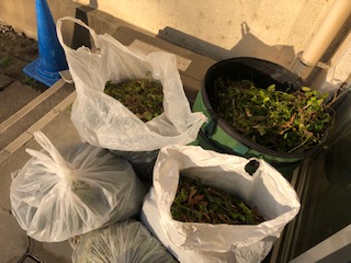 右の写真は、昼休みに成城三丁目緑地で駆除してきたノハカタカラクサです。環境委員会の5・6年生と一緒に4年生もおおぜい参加しました。毎週火曜日の昼休みの有志児童による校外活動として定着しています。