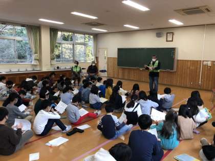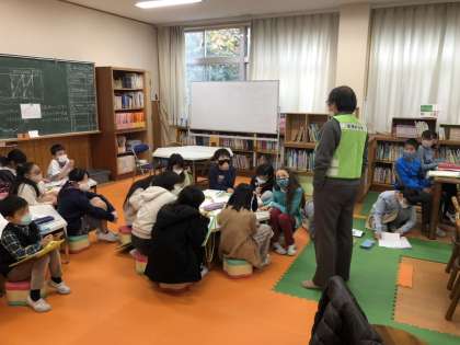 「自然災害についての地域の対応について知り自分たちも何か役に立ちたい」「地域の人たちと町をきれいにしたい」というテーマで学習に取り組んでいる複数のグループの依頼をお受けくださり、成城自治会の皆様がお話をしてくださいました。いろいろなクラスから希望するグループの子たちが参加して合同の学習会の形で運営しました。