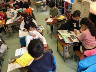右の写真は、1年生国語「じどう車くらべ」の学習のようすです。学びのまとめを「じどう車ずかん」として表現しています。様々な「はたらく車」への関心の高まりがうれしいです。