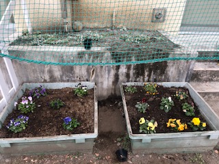 左の写真は、地域のお店に直接出向いて自分たちで選んだ苗の植え付けが終わったようすです。土を耕すところから何日もコツコツと活動を続けてきて、ようやく満足いく段階に到達したと知らせてくれました。