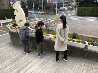 活動のお手本にしているのは、栽培委員会の上級生が正門のプランターでお世話しているパンジーです。