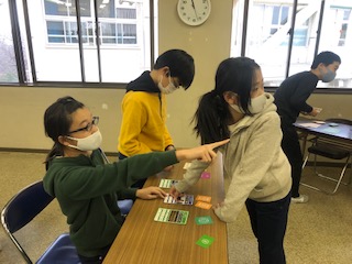 中央の写真で子どもたちがしきりに気にしているのは、教室前面のホワイトボードに並べられていく「経済」「環境」「社会」の3色のマグネットです。このクラスは前半では、経済が18ポイント、環境が2ポイント、社会が3ポイントで終了しました。これは参加者全員で創り出す世界の状況を表しています。どのプロジェクトを実行するかで世界の状況が刻々と変わっていき、参加者全員が行うプロジェクトの結果として2030年の世界が現れていく、という風にゲームが進んでいきます。