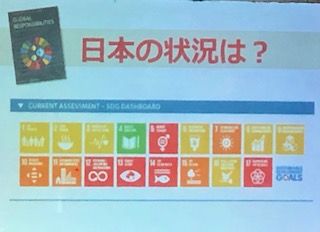 右の写真は、国連のホームページで示されている日本の現状です。17のゴールのうち4番目の「質の高い教育をみんなに」だけが緑色、つまり達成されています。識字率などが関係しています。その他の16の目標は、ご覧の通り赤やオレンジや黄色です。まだまだ達成には遠い状況です。このような評価があるからこそ一人一人の行動を変容させていく取り組みが具体化できるのだと思います。全体で90分間のワークショップでした。