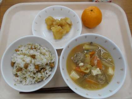 豆ごはん じゃがいもの甘辛煮 いわしのつみれ汁 ぽんかん 牛乳