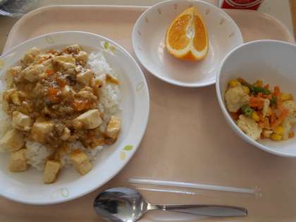 マーボー豆腐丼 カリフラワーのサラダ いよかん 牛乳