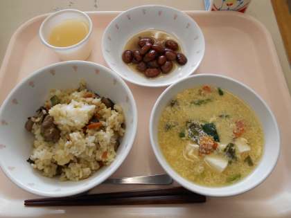 五目ごはん 煮豆 かきたま汁 りんごゼリー 牛乳