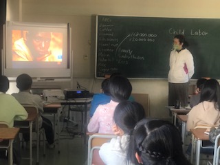 左の写真は、6年外国語の学習のようすです。テーマは”Child Labor(児童労働)”です。視聴した動画からキーワードをつかんでいる場面です。”Child Labor(児童労働)”のABCとして出てきたのは、Banana,Coffee,Diamond,Electronics,Hazel nut,Leather,Melon,Palm oil,Rice,Suger cane,Tabaco などでした。自分たちと遠い問題のように感じるかも知れませんが、1億6800万人と言われる児童労働と、自分たちの生活とのつながりを考える展開でした。有害物質であるCobaltの採掘作業に素手で作取り組む子どもたちのようすも視聴しました。次回はフェアトレードについて知り、エッセイを書く予定です。