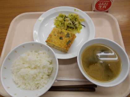 ごはん 千草焼き キャベツの塩昆布和え じゃがいもとわかめのみそ汁 牛乳
