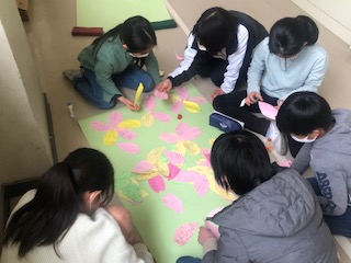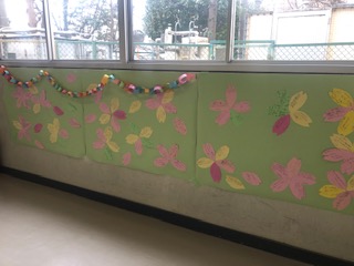 中央昇降口のわくわくポストに寄せられた温かいメッセージの花びらを、企画委員会と代表委員会の子どもたちが掲示しています。ありがとうの花がたくさん咲いています。