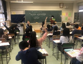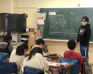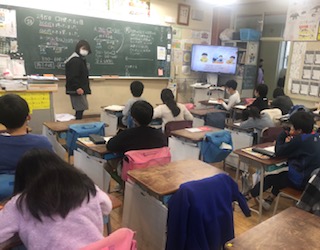 写真は、3年算数「お話を式に表そう」の学習のようすです。2クラスを3つのグループに再編成して習熟度別指導を行っています。担任2名と都講師1名のチームで計画して同じ学習内容を実施しています。
